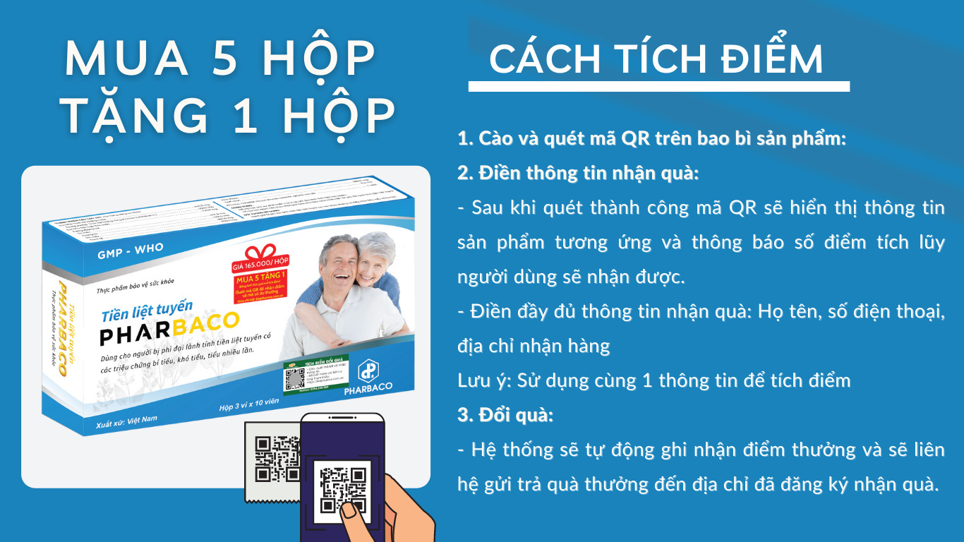 Khi mua 1 hộp sản phẩm Đại Tràng Pharbaco hoặc Tiền liệt tuyến Pharbaco Quý Khách hàng sẽ nhận được 1 mã thẻ tích điểm tương ứng với 1 điểm. Với mỗi 5 điểm Quý Khách hàng sẽ được tặng miễn phí 1 hộp Đại Tràng Pharbaco hoặc Tiền liệt tuyến Pharbaco.