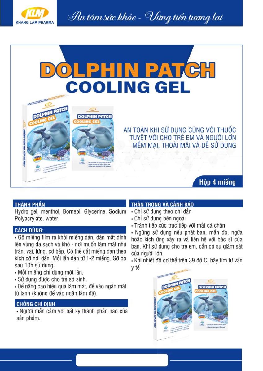 Miếng dán hạ sốt Dolphin Patch (Cooling Gel) có công dụng làm mát, hạ nhiệt nơi chườm, khi nóng, sốt, hoặc nhiệt độ cơ thể cao do say nắng.