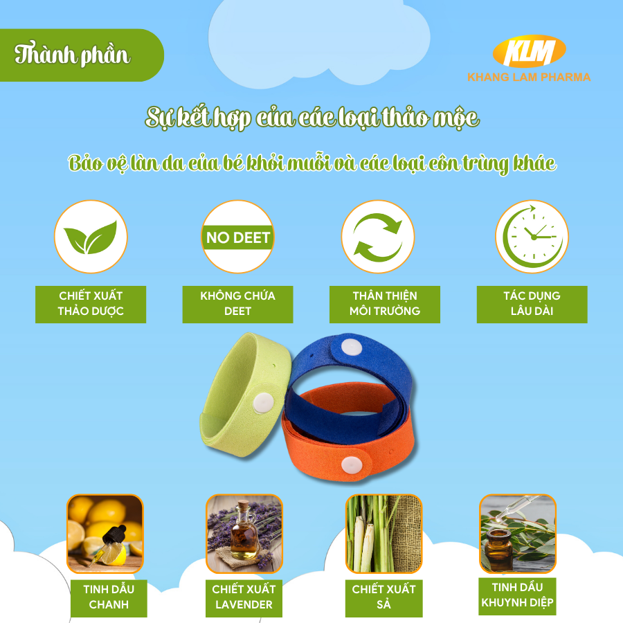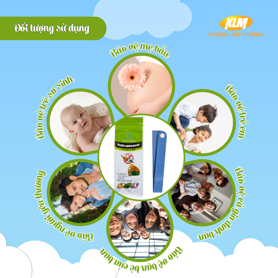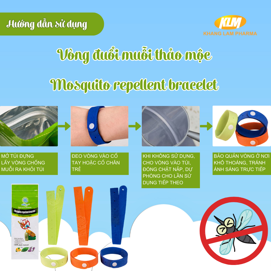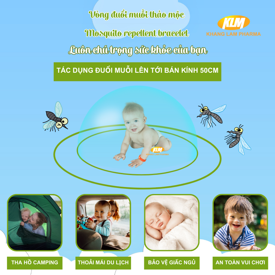 Vòng đeo đuổi muỗi có tác dụng lên tới 240 tiếng và trong bán kính 50cm, dùng được cho trẻ sơ sinh, trẻ em và cả người lớn.